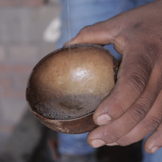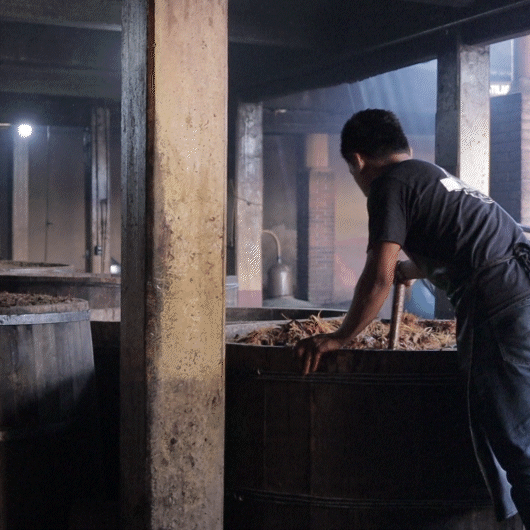 Finally, the fermented liquid is placed in a copper pot over an open flame, which causes the vapors to rise through a still. The liquid is distilled twice to refine the purity of the spirit.